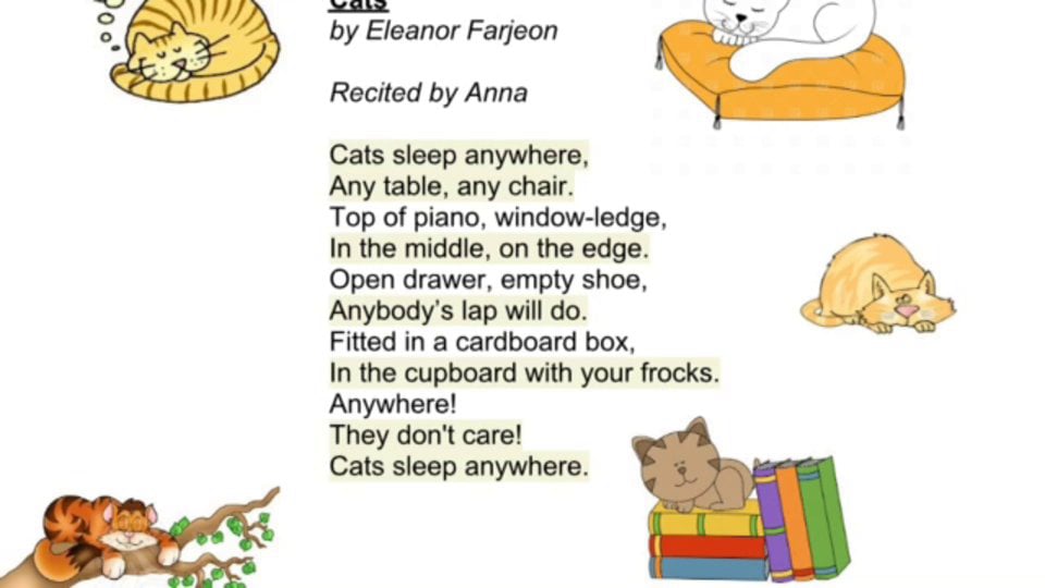 Class_1_New_Voices_Poem_No_9_Cats_Sleep_Anywhere_Part_2 YouTube Cats Sleep Anywhere Poem Pdf top of piano, window ledge, in the middle, on the edge. Cats sleep, anywhere, any table, any chair. Provided at no charge for educational purposes. cats sleep anywhere : english [en],.pdf, π/ia, 9.0mb, π book (unknown), catssleepanywher0000farj. eleanor farjeon's classic poem provides a simple, charming text for breathtaking illustrations by popular british painter. Open drawer, empty. Cats Sleep Anywhere Poem Pdf.